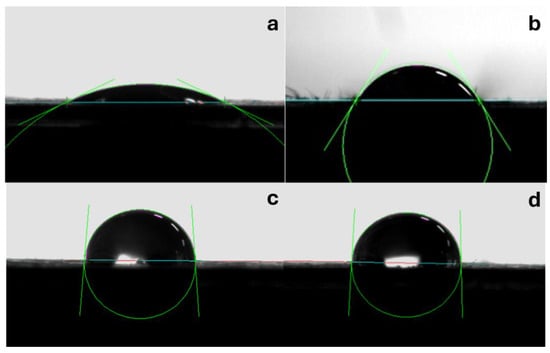 Water contact angles for, (a) natural Bond at 55 s, (b) natural Kraft at 55 s, (c) coated Bond at 55 s, (d) coated Kraft at 55 s.