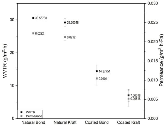 Another important parameter to consider when analyzing coatings on paper is the extent to which the permeability values change after the coating is applied. Thus, Figure 5 presents the water vapor transmission rate (WVTR) and water vapor permeance (P) obtained for both natural and coated papers.