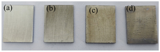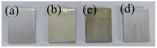 Macroscopic morphology of aluminum alloy after furnace oxidation at different temperatures: (a) not oxidized; (b) 450 °C; (c) 500 °C; (d) 600 °C.