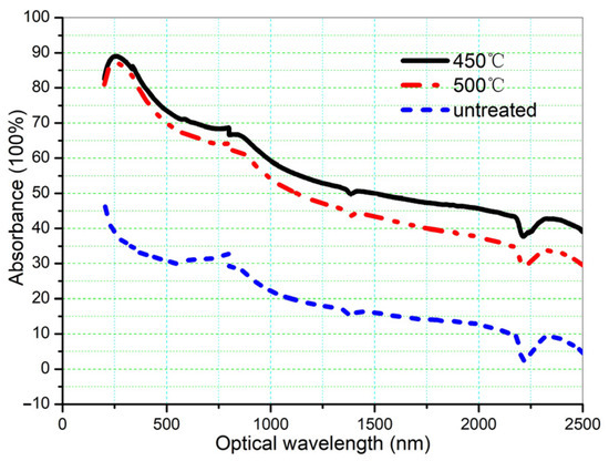 Figure 3 shows the dependence of absorption ability on wavelength, λ, for two different surface conditions at room temperature and an angle of falling of 0° towards normal to the surface. From Figure 3, it is clearly observable that the absorption ability decreased with increasing wavelength and that the surface absorbance was significantly improved by furnace oxidation compared with that of the surface without any treatment. However, there was little difference in absorbance at different oxidation temperatures. Considering the comparison of surface macroscopic morphology, the color change in the surface after furnace oxidation was the main reason for the significant increase in surface absorbance, and the color change of the sample after high-temperature oxidation at 500 °C was obvious and the absorbance was low. There were clearly observable differences between the aluminum alloy surfaces treated under different conditions. For example, the absorption ability decreased as the light shifted from the visible spectrum to the far infrared range. As a polyvalent metal, Al shows a specific change in absorption with wavelength; it shows a maximum and moderate absorption at λ = 840 nm but low absorption at almost all other wavelengths [24,25]. The authors of [25] found that the spectral absorbance value for aluminum (99.6% aluminum and sandblasted surface; the sandpaper mesh size is not mentioned in this reference) for wavelengths close to IR (1085 nm, very close to our present study’s 1064 nm wavelength) was approximately 5.2% [25]. Under processing, the surface temperature is very important for increasing the absorption of laser radiation falling on materials [25,26]. If the materials reach their melting points, their absorption ability changes rapidly. In the range of the optical absorption of laser radiation on the metal, photon–electron interactions occur. This results in the absorption of electromagnetic energy, which is transformed into heat energy. The propagation of heat in the material is described by the phenomenon of thermal conductivity [25,26].