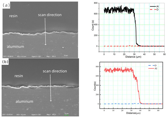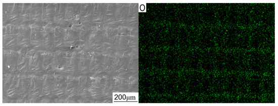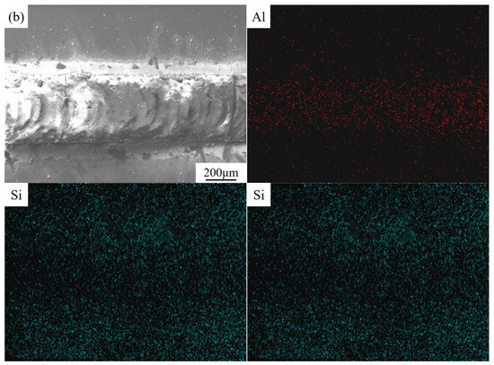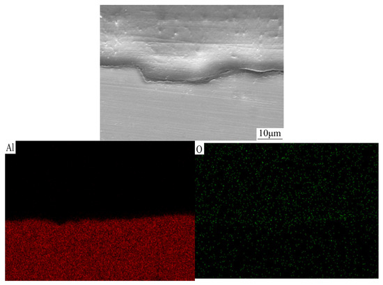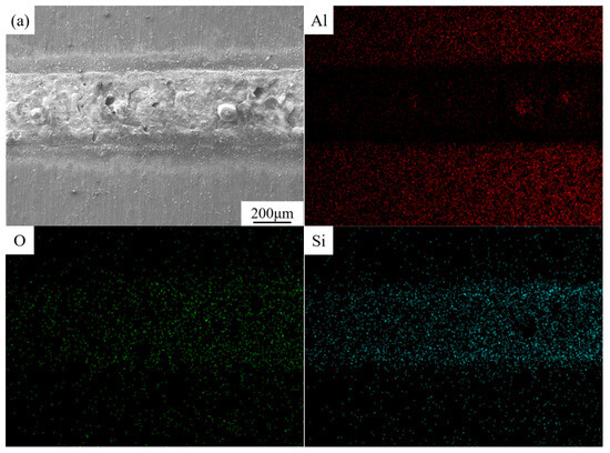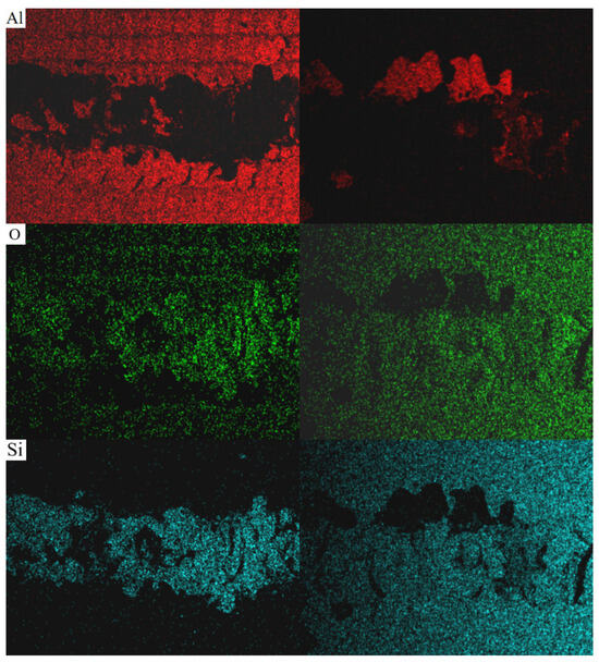 The element distribution at the interface of the aluminum alloy after laser surface treatment was further explored. Figure 16 and Figure 17 show the EDS surface scanning analysis at the interface when a laser power of 300 W was used. It is obvious that the distribution of elements in the jagged structure was distinct, and there was only a trace amount of O at the edge of the metal, indicating that the surface of the aluminum alloy after laser treatment showed little oxidation. No new oxide layer was produced, as would be induced by micro-arc oxidation treatment. The laser surface melting technology only affects the physical morphology of the aluminum alloy’s surface.