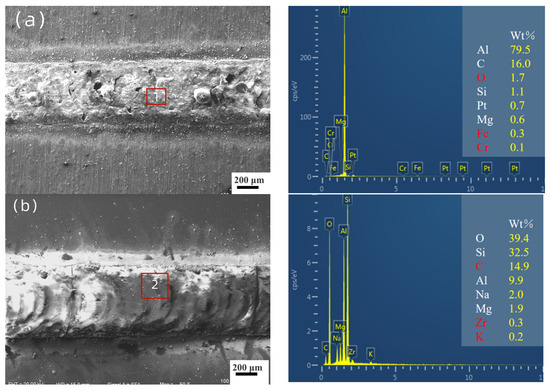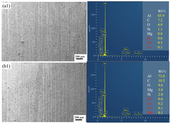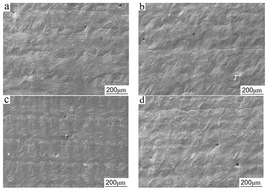 The surface melted with the laser was observed using SEM, and the results are shown in Figure 14. It can be observed that the surface of the aluminum alloy substrate adopted a scaly morphology, due to how the laser acted on the positions of halves of the two spots in an overlapping fashion. Upon comparing the morphology formed with different powers, it can be observed that, with an increase in power, the cracks on the surface of the aluminum alloy increased, which was due to an increase in stress on the surface. Additionally, some pores could be formed on the melted aluminum alloy surface.