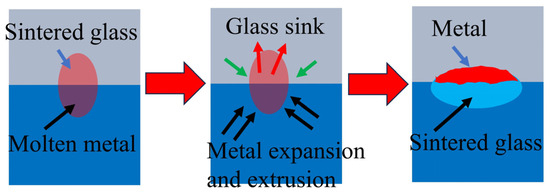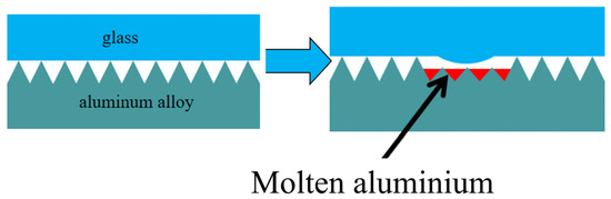 It was found that the welding strength of the sample polished with 180 mesh sandpaper was very poor, while it was difficult to successfully weld the sample polished with 2000 mesh sandpaper. The glass side was not melted and combined with metal. The main reason for this phenomenon is that the metal surface polished with 180 mesh sandpaper formed a deep gully, which led to very low adhesion between the glass and metal surface. In addition, the deeper gullies caused the aluminum alloy to flow into these gullies in large quantities after melting without participating in the material exchange with the molten glass, thus affecting the strength. Figure 9 shows a schematic diagram of the material exchange that occurs during the welding of aluminum alloy and glass, which is the main reason for the combination of aluminum alloy and glass and has a certain strength. Previous experiments have also shown that the weld sections of samples with better bonding strength show this phenomenon.