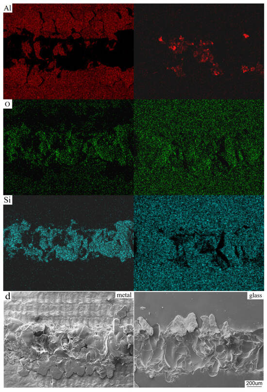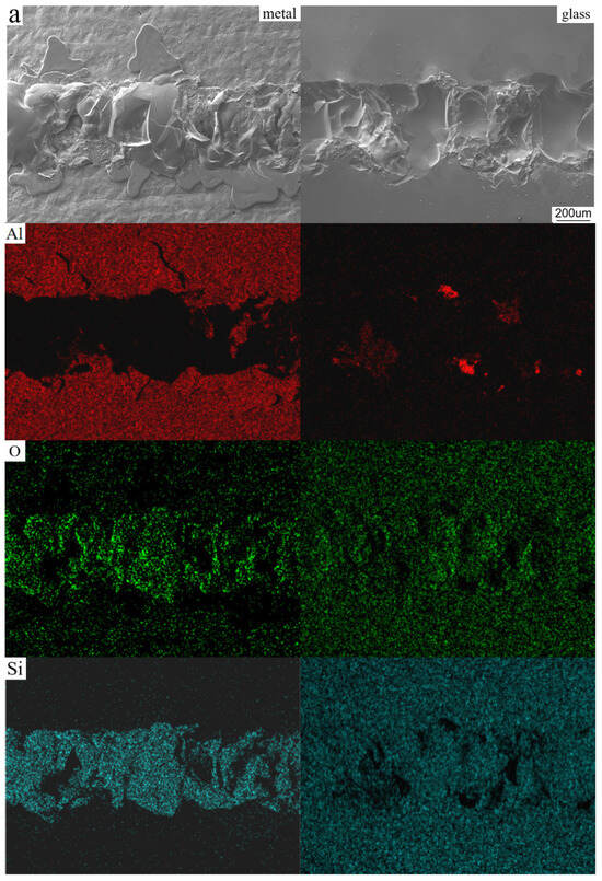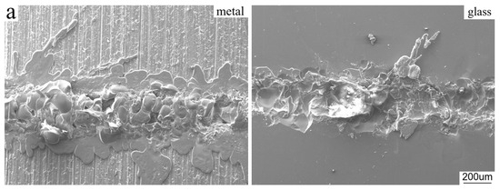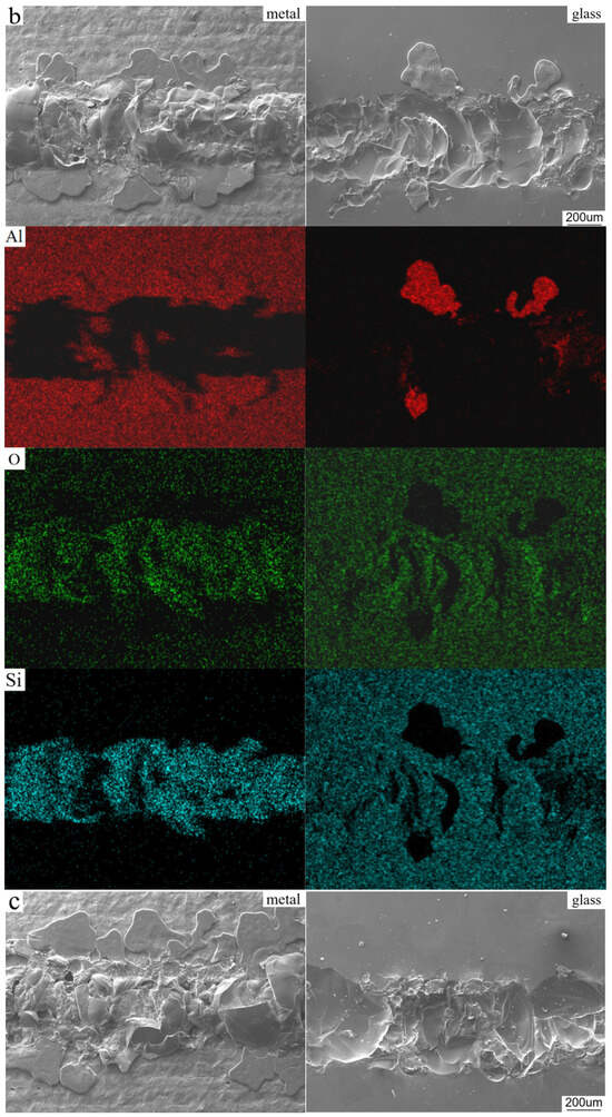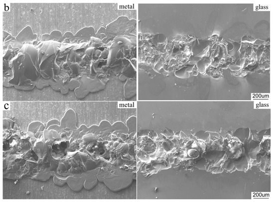 Shear force tests were carried out on the samples after grinding with different mesh sandpaper and welding, and the fracture morphology was analyzed using SEM, as shown in Figure 11. It can be clearly observed that the molten materials adhered to the metal and glass sides.