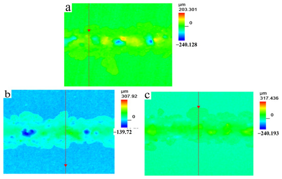 A 3D profile scan of the fracture was performed; the results are shown in Figure 12 and Figure 13. It can be observed that the weld width achieved with 180-mesh sandpaper was obviously smaller than that of the other two sandpaper-polished samples, which was also due to the large amount of molten metal flowing into the polished gully. It can also be observed that, as the roughness decreased, the residual glass at the fracture became more concentrated, which meant that the distribution of energy was more concentrated. The main reason for this phenomenon is that, with a decrease in roughness, it is more difficult for the aluminum alloy to absorb the laser energy, and the energy does not spread as easily.