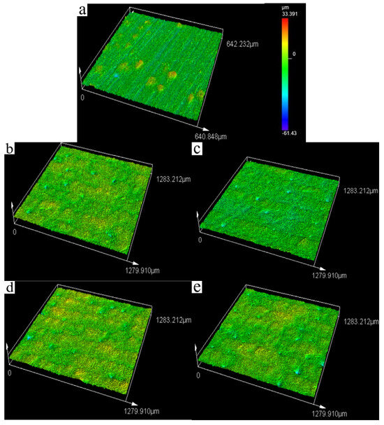 Three-dimensional morphology of samples treated with different laser powers. (a): untreated; (b): 150 W; (c): 200 W; (d): 250 W; (e): 300 W).