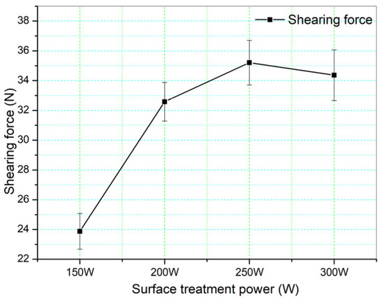 Samples whose surfaces were melted using different laser powers were laser welded. The laser powers were 150, 200, 250, and 300 W; the scan speed was 1 mm/s; the defocus amount was 0 mm; and the pulse width was 2.5 ms. After laser welding, the shear force was tested; the results are shown in Figure 18. The shear force increased with an increase in power until the laser power was 250 W, peaking at 35.38 N; thereafter, decreasing with a further increase in power. When the power was 300 W, the shear force began to decrease.