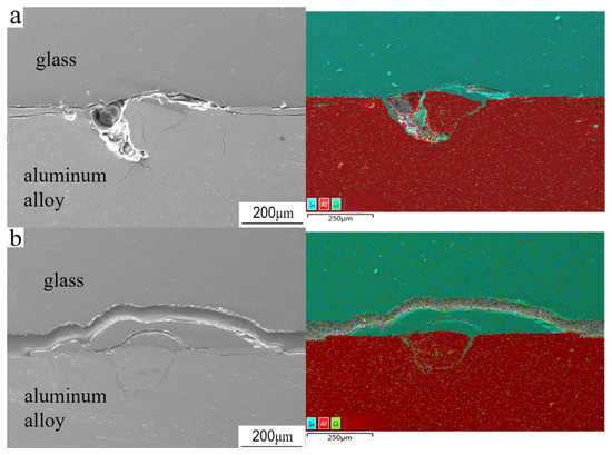 Although the absorbance of the aluminum alloy surface was significantly improved by furnace oxidation and the oxide film was very thin, the thermal conductivity was not affected; however, the welding strength was very unsatisfactory, and the shear force of the welded sample was less than 5 N. The fracture topography was analyzed using an SEM, as shown in Figure 5. It can be observed that the fractures on the aluminum alloy and the glass show obvious melting marks, but there are no fracture traces or spatter, which is an obvious difference from the fracture morphology of samples successfully welded under normal circumstances. The energy spectrum test results show that, although the aluminum alloy side presented a glass substance and aluminum elements could be found on the glass side, there was no metal splash on the aluminum alloy side. There was also no brittle fracture on the glass side, which indicates that, although the aluminum alloy and glass had melted, they were not well fitted.