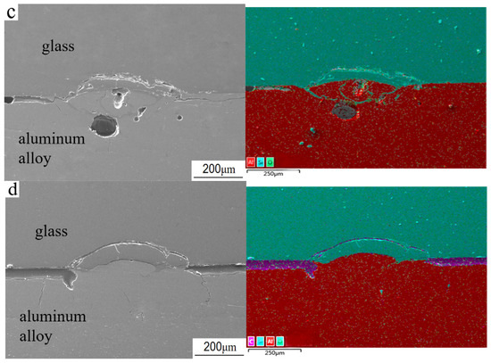 The weld cross-sections of the samples subjected to different laser pretreatment powers are shown in Figure 20. It can be observed that, as the laser pretreatment power continued to increase, the weld continued to deepen inward. However, when the laser power reached 300 W, the weld showed a layered shape, and no obvious glass infiltration was observed. Considering this in combination with the SEM surface morphology analysis, this is because the local temperature of the aluminum alloy is too high during high-power laser treatment, forming an oxide film, which hinders the downward infiltration of molten glass and the expansion and floating of the aluminum alloy.