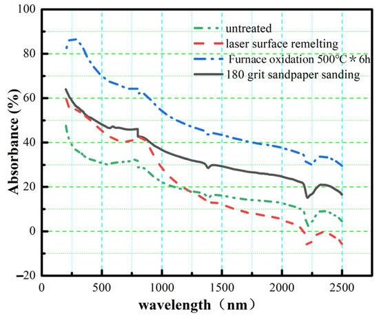 Figure 22 shows a comparison of the absorbance following different surface treatments, and it can be observed that the surface of the aluminum alloy treated with laser surface remelting has a steeper curve and is more sensitive to wavelength changes than those in other cases. The wavelength of the laser used in this experiment was 1064 nm, and the absorbance of the aluminum alloy surface after laser remelting and 180-grit sandpaper grinding was not similar to that obtained with laser remelting, while the absorbance of aluminum alloy following high-temperature oxidation was significantly higher.