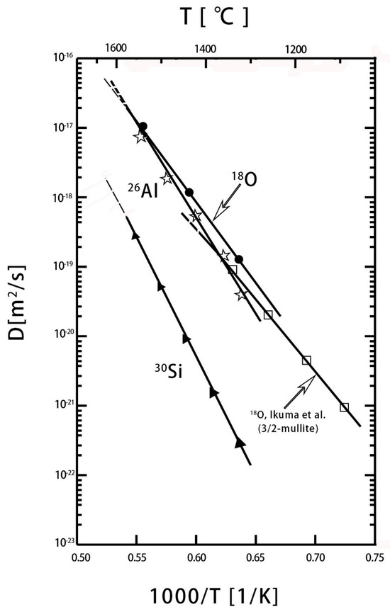 Temperature-dependent 18O, 30Si and 26Al diffusion in 2/1-mullite single crystals parallel to the b ([0 1 0]) and c ([0 0 1]) axes. Note that the atomic diffusion of species is isotropic with respect to the mullite crystal structure. T, temperature; D, diffusion coefficients ([28,29,30,31]). (Oxygen has three types of isotope, i.e., 17O, 18O, 16O; Silicon also has three types of isotope, 28Si, 29Si, 30Si. And aluminium has a total of 24 types of isotope. Then, here 18O, 30Si and 26Al mean that the elements of isotope are selected in this experiment).