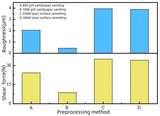 Comparison of the test results for the surface roughness and shear forces of the specimens after welding with different pretreatment methods.