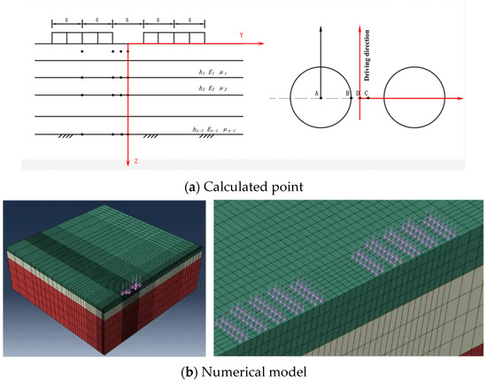 The numerical model and the calculated point are shown in Figure 1. In the XOY horizontal plane of Figure 1, point A’s coordinates are (0 cm, −15.975 cm), point B’s coordinates are (0 cm, −5.325 cm), point C’s coordinates are (0 cm, 0 cm), and point D’s coordinates are (0 cm, −2.6625 cm). The position coordinates of the four points are determined according to the Chinese design specification “Specifications for Design of Highway Asphalt Pavement (JTG D50-2017)”. The values of mechanical response are selected by the maximum values of points A, B, C, and D for each mechanical response. The maximum values represent the worst case of one mechanical response. The equivalent circle has a radius of δ = 10.65 cm, and the standard axial load condition of p = 0.707 MPa is utilized.