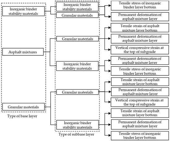 The current pavement design code classifies pavement structures into six types based on their base and base materials (asphalt mixture, inorganic binder stability materials, and granular materials) [21]. The design index system is depicted in Figure 2.