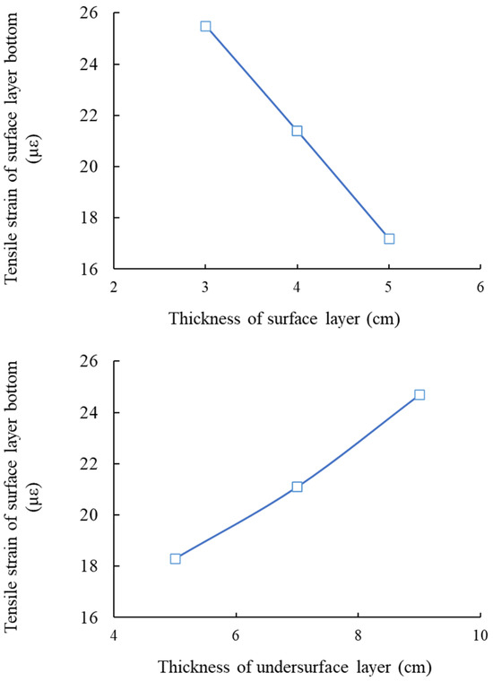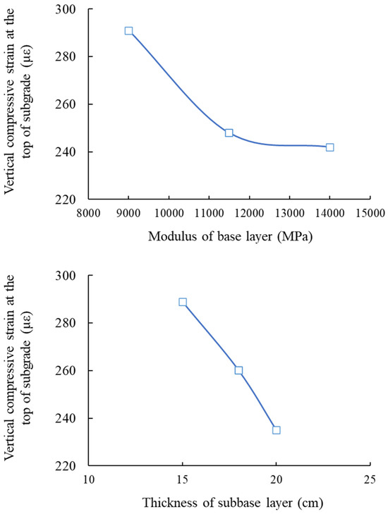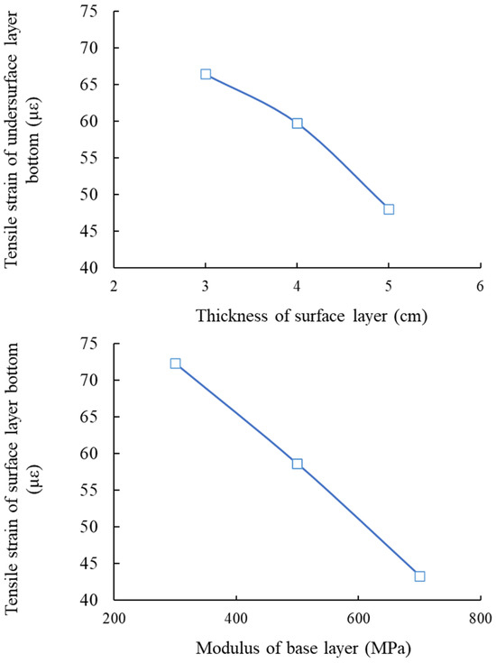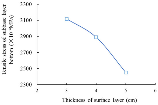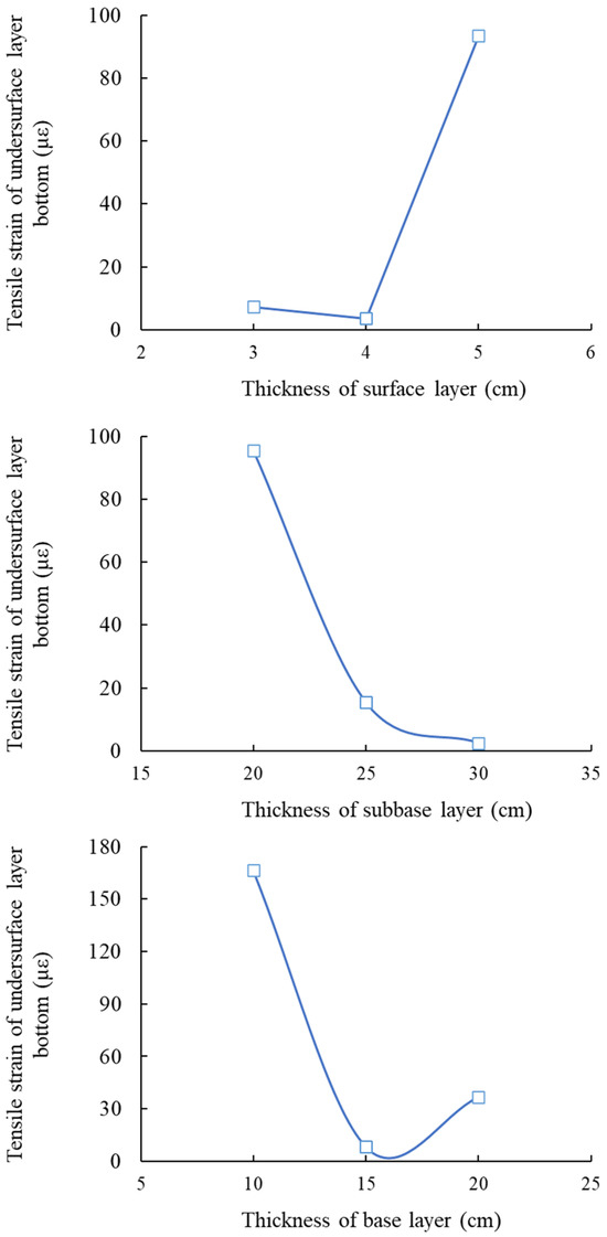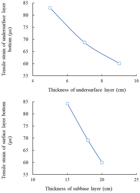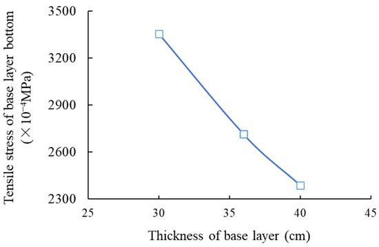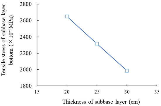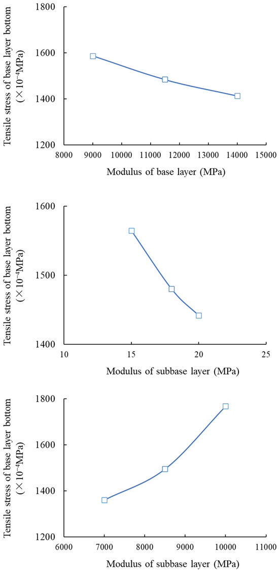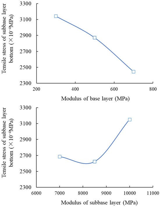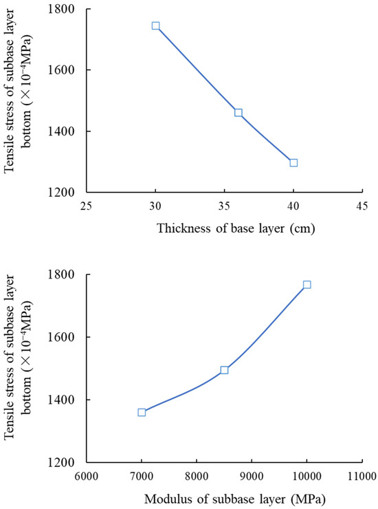 Figure 4 illustrates that an increase in the thickness of the inorganic binder base and a decrease in the modulus of the inorganic binder base lead to a decreasing trend in the tensile stress at the bottom of the subbase layer. Therefore, the thickness of the inorganic binder base is considered high, while the modulus of the inorganic binder base is considered low.