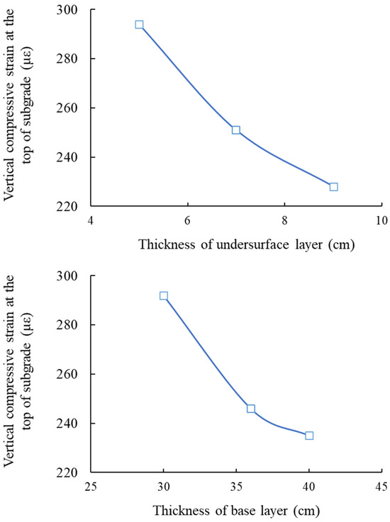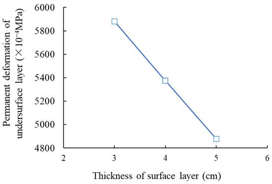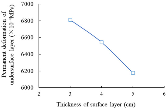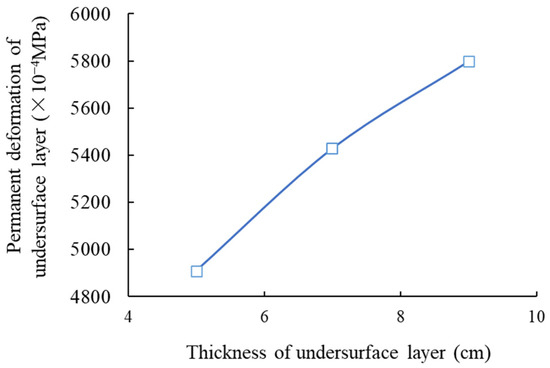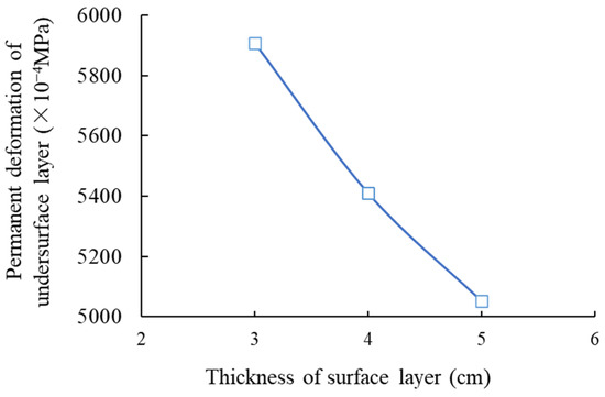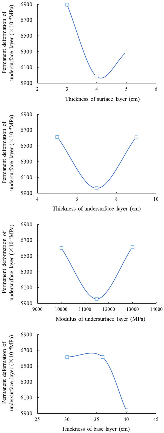 Figure 22, Figure 23, Figure 24 and Figure 25 depict the trends in the key indices that affect the bottom strain of the surface layer, bottom strain of the undersurface layer, vertical compressive strain of the top surface of the subgrade, and permanent deformation of the undersurface layer under working condition No. 6.