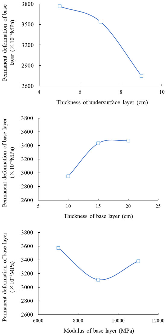 Figure 9, Figure 10, Figure 11, Figure 12, Figure 13 and Figure 14 illustrate the influential trends in the key indicators on the permanent deformation of the undersurface layer, the permanent deformation of the asphalt mixture base layer, the vertical compressive strain at the top surface of the roadbed, and the tensile strain at the surface layer, undersurface layer, and asphalt mixture base layer, respectively.