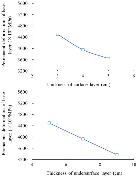 Table 12 shows that the thickness of the surface layer, the thickness and modulus of the undersurface layer, the thickness of the base layer, and the modulus of the base layer all significantly affect the permanent deformation of the undersurface layer in the asphalt mixture, with the thickness of the HMAC surface layer having the most significant impact. Figure 6 depicts the influential trends in the key indicators on the permanent deformation of the undersurface layer.