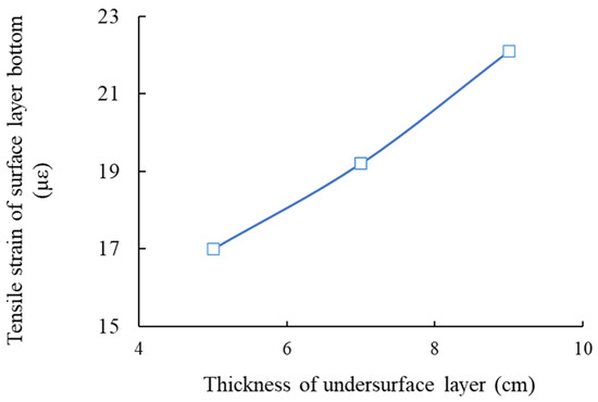 Figure 15, Figure 16 and Figure 17 illustrate influential trends in the key indicators on tensile stress at the bottom of the subbase layer, the permanent deformation of the undersurface layer, and the permanent deformation of the asphalt mixture base layer under working condition No. 4.
