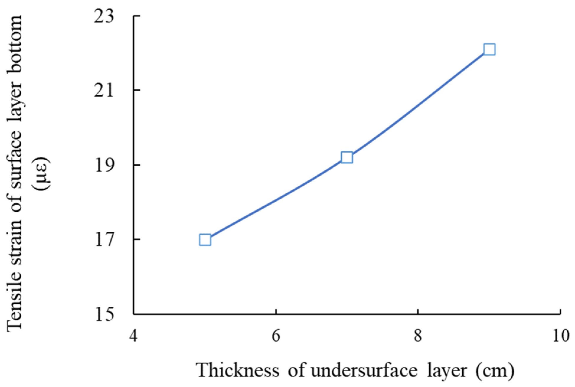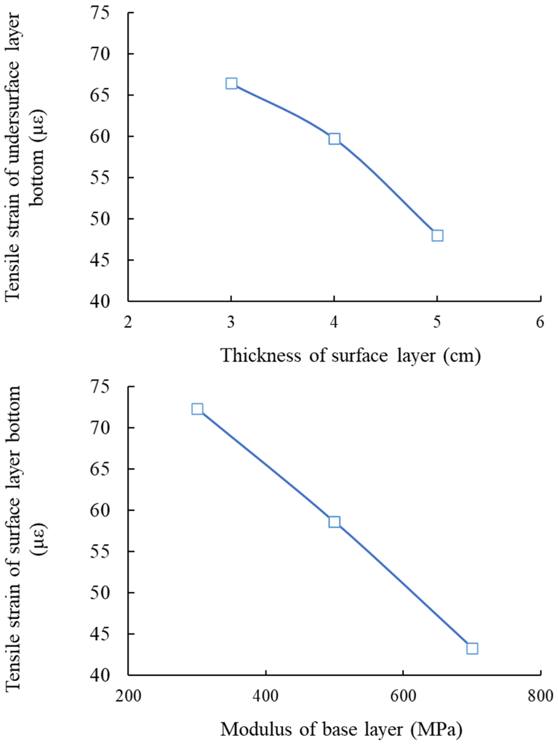 - For a granular material base layer, surface and undersurface layer thickness are the key factors for mechanical response. A thick surface layer and thin undersurface layer are beneficial for the mechanical response of pavement structure.