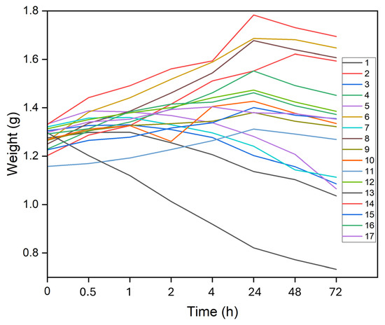 Fluid absorption rate of the 17 hydrogels produced using CCD in the PBS (gray lines) and DMEM (pink lines).