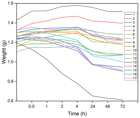 Swelling and/or degradation of the hydrogels in PBS, produced using the CCD methodology. The values represent the means of 4 experiments and are expressed in weight (g).