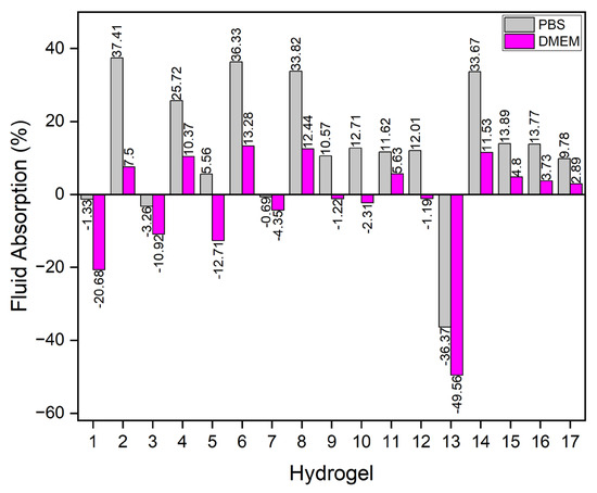Figure 4 illustrates the swelling or degradation rates, representing the maximum weight gain or loss. It was also evident that the hydrogels swelled more in the PBS than in DMEM. The highest swelling rate observed in the PBS was 37.41% for hydrogel 2, while in DMEM, hydrogel 6 reached 13.26%. Hydrogel 13 exhibited the highest degradation rates in both the PBS and DMEM, at −36.37% and −49.56%, respectively.