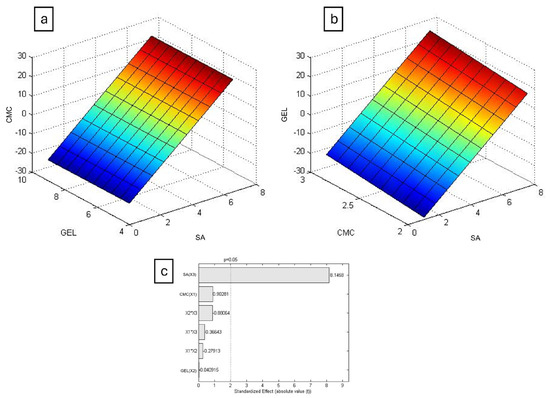 Three-dimensional response surface graphs by a linear model, produced using the swelling degree (SD) of the hydrogels in the PBS. (a) Comparison between gelatin and alginate; (b) comparison between carboxymethyl cellulose and alginate; (c) Pareto’s chart of the variables. p < 0.05. Graph generated by Chemoface software.