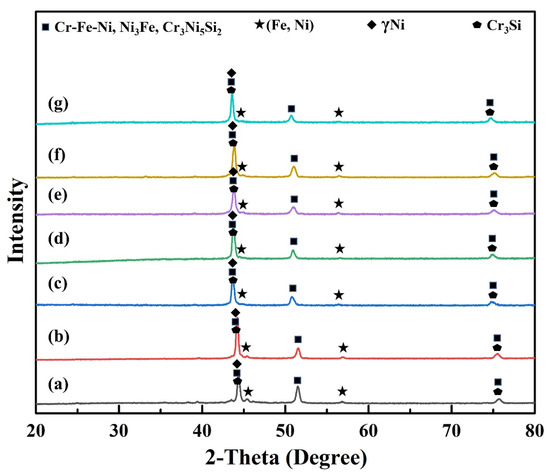 XRD patterns of x wt.% (Al2O3@Y2O3)/Ni60A composite coatings with (a) x = 0, (b) x = 2, (c) x = 4, (d) x = 6; x wt.% (Al2O3-Y2O3)/Ni60A composite coatings with (e) x = 2, (f) x = 4, (g) x = 6.