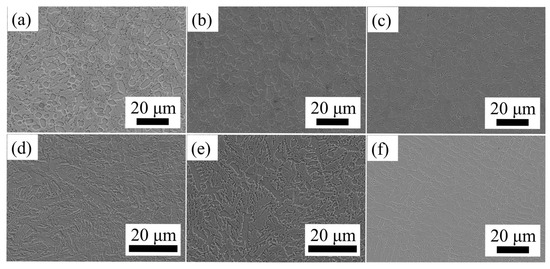 Figure 4a–c exhibit SEM images of the surface microstructure of the x wt.% (Al2O3@Y2O3)/Ni60A composite coatings (x = 2, 4, and 6). The micrographs reveal that the composite coating with x = 2 primarily consists of equiaxed grains (Figure 4a). However, as the value of x increases, grain coarsening occurs. At x = 6, coarse columnar grains are present (Figure 4c). These observations suggest that the addition of the core–shell structure should be limited to a certain range. The precipitated phases within the coating primarily exist in the form of petal-like and irregular blocky morphologies, which are significantly finer compared to those observed in the Ni60A coating (Figure S1 of the Supplementary Materials). It is worth noting that, when the same quantity is added, the (Al2O3-Y2O3)/Ni60A coating microstructure is significantly coarser compared to that of the (Al2O3@Y2O3)/Ni60A composite coating, as evident in Figure 4d–f. This phenomenon may be attributed to the separate and uneven refinement effects of Al2O3-Y2O3 as a mechanical mixture. Conversely, the core–shell-structured Al2O3@Y2O3 exhibits a synergistic dual-action mechanism between the rare earth elements and the hard ceramic particles, leading to the more effective refinement of the coating microstructure.