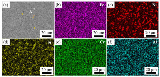 To investigate the specific distribution of various elements, EDS spectra of the 2 wt.% (Al2O3@Y2O3)/Ni60A composite coatings are shown in Figure 5. It is apparent that elements such as Fe and Cr are dispersed throughout the entire coating surface, including the matrix and the precipitated phase. Conversely, Ni and Si mainly exist in the matrix (as indicated by point A in Figure 5a). Al, present in relatively low concentrations, can be observed almost uniformly distributed across the entire coating surface. As will be further explored, this distribution notably contributes to enhancing both the hardness and the wear resistance. Nevertheless, it is noteworthy that Y remains undetected through EDS. This suggests that Y may have a tendency to readily re-oxidize into Y2O3 particles during solidification. These particles, subsequently, may undergo erosion during the etching process, resulting in the formation of small corrosion pits (highlighted by the yellow circles), as depicted in Figure 5a. Ongoing research endeavors aim to provide deeper insights into this phenomenon.