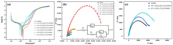 (a) Polarization and (b) Nyquist curves of x wt.% (Al2O3@Y2O3)/Ni60A and (Al2O3-Y2O3)/Ni60A (x = 0, 2, 4, 6) composite coatings (the scatter charts stand for the experimental plots and the line charts stand for the modeled plots. Inset (b) is the equivalent circuit used for fitting of the EIS plots). (c) Enlarged curves to show the smallest three curves shown in (b).