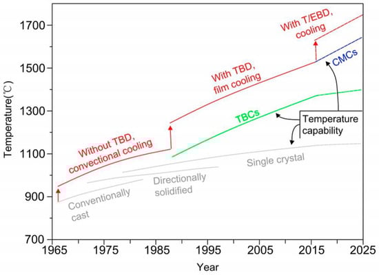 Although TBCs demonstrate stable performance at room temperature, significant high-temperature corrosion issues continue to arise during gas turbine operation, critically reducing the lifespan of these coatings. As aero-engine development progresses towards higher thrust-to-weight ratios and increasing turbine inlet gas temperatures, the temperature endurance capability of existing TBCs is approaching its limits. Consequently, current TBCs are no longer able to meet the ever-increasing high-temperature performance demands of modern engines [11,12]. Figure 1 shows the advancements in the development of revolutionary ceramic coatings.