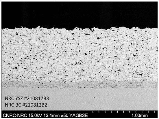 Plasma spraying has a series of advantages, such as its simple process, high deposition rate and efficiency, low cost, and so on [49]. However, there are a lot of pores in the coating, as shown in Figure 3. Because of the high amount of slag, inclusions, and microcracks in the plasma-sprayed coating, these defects can easily cause salt corrosion, sulfuration, pitting, and oxidation at high temperatures, which will reduce the bonding strength of the coating and even lead to failure due to peeling off. The coating has poor thermal shock resistance, so it can only deposit simple-shaped workpieces, and it is difficult to process uniform and dense coating.