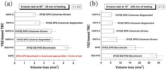 Different preparation methods and volume loss of different components are shown in Figure 4 [51]. The study evaluated the erosion performance of YSZ-based TBCs produced by SPS, EB-PVD, and APS. The results indicated that all SPS TBCs exhibited superior erosion resistance compared to those fabricated by EB-PVD and APS.