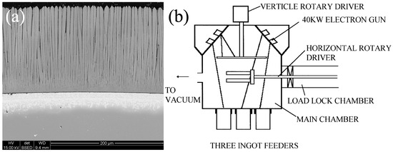 The preparation of TBCs by PVD technology is based on the evaporation of source material on the substrate by physical methods such as ion plating, sputtering, and molecular beam epitaxy [55]. When EB-PVD is employed for coating fabrication, the columnar crystal structure perpendicular to the surface of the substrate can be obtained, as shown in Figure 5a. Figure 5b shows the schematic drawing of EB-PVD equipment [56].