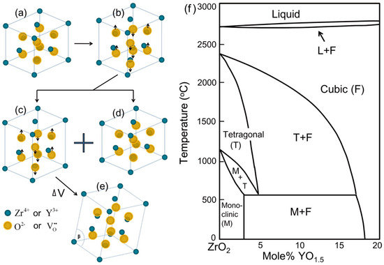 (a,d) C phase, Fm3m a = b = c, β = 90°; (b) T′ phase, P42/nmc, C > B = A, β = 90° oxygen displacement; (c) T phase, P42/nmc, cT > cT′ > b = a, β = 90°, larger oxygen displacement, lower Y3+ concentration and oxygen vacancies; (e) M phase, P21/c, c > b > a, β = 99.194°; (f) phase diagram of yttria-stabilized zirconia [80].
