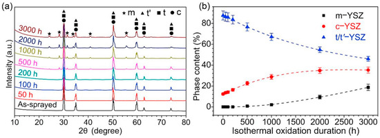 (a) XRD patterns of the plasma-sprayed 8YSZ coatings before and after isothermal oxidation; (b) change in phase contents with oxidation duration [81].