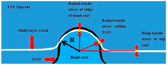 The thickness of Al2O3 coating increases gradually between 1–13 μm, which leads to the mismatch of internal stresses in the coating system. It is an important reason for the failure of TBC. A schematic model of the failure mode is shown in the Figure 8.