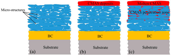 Schematic diagram of CMAS corrosion of YSZ coating [99]. (a) Schematic diagram of the microstructure within the TBC; (b) CMAS deposition on the surface of the TBC; (c) Penetration of CMAS deposits into the interior of the TBC.