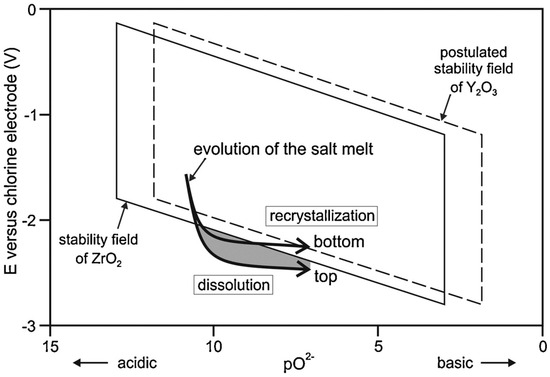 Müller et al. [117] presented a diagram (Figure 10) illustrating the evolution of the salt melt, which leads to the dissolution and recrystallization of ZrO2, accompanied by changes in electromotive force and pO2− values.