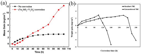 Liu et al. [118] investigated the hot corrosion behavior of ScYSZ TBCs in the presence of Na2SO4 and V2O5 salts at 1000 °C, as shown in Figure 11a. The results indicated significant degradation of the coating in molten salt, with both samples exhibiting a positive mass gain due to the formation of the TGO layer and the oxidation of the nickel-based alloys [119,120]. Mohammadi et al. [121] pointed out that the weight gain was a positive value at first (Figure 11b), which then decreased sharply to negative value. The life of gradient coating is longer than that of traditional coating.