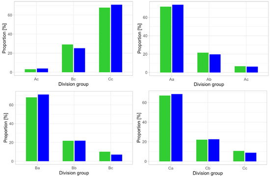 Within each group resulting from classification in terms of pore surface area, most were vertical in orientation (groups Aa, Ba, Ca), while there were fewer with a diagonal orientation (Ab, Bb, Cb) and least with a horizontal orientation (Ac, Bc, Cc), which was related to the fact that most fibres were arranged according to the direction of production (Table 7 and Table 8). Regardless of size, vertically oriented pores were more stretched than horizontal-oriented pores, as indicated by the values of the e and f parameters (Table 7 and Table 8). The average size of the large, vertically oriented areas (Aa) was higher for carding machine No. 2 than for carding machine No. 1. On the other hand, for areas with a horizontal orientation (Ac), this value was significantly higher for carding machine No. 1. In the case of medium and small areas, their size was comparable regardless of orientation (Table 7 and Table 8).