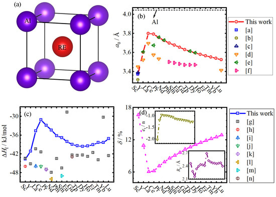 - Liu, T.; Ma, T.; Li, Y.; Ren, Y.; Liu, W. Stable, mechanical and thermodynamic properties of Al-RE intermetallics: A First-principles study. J. Rare Earths 2022, 40, 345–352. [Google Scholar] [CrossRef]