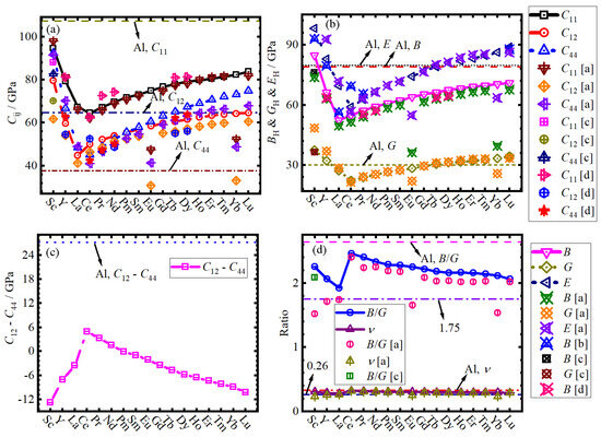 - The Cauchy pressure C12-C44 first increases linearly from AlSc to AlCe and then decreases linearly to AlLu. The Pugh’s ratio B/G decreases from AlSc to AlLa and increases to AlCe; finally, it decreases linearly to AlLu. Whereas Poisson’s ratio ν changes a little.