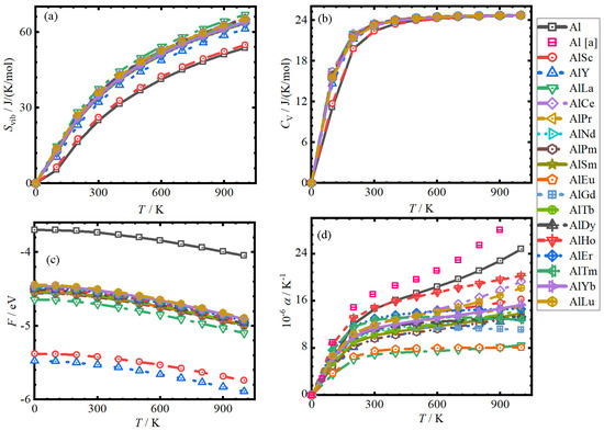 - With the increase in temperature, the vibrational entropy Svib and heat capacity CV show a regularity rise feature, while the Gibbs free energy F of all cases decreases linearly in the whole temperature. The expansion coefficient αT increases sharply in the temperature range of 0~300 K at first, and then it changes a little, except for those of Al, AlHo, AlCe and AlLu, which increase linearly after 300 K.