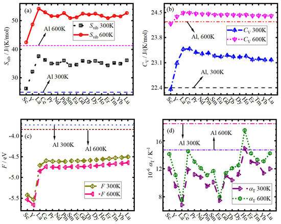 - Both Svib and CV increase from AlSc to AlLa and then change a little, while the F first decreases AlSc to AlY and then increases to AlLa; finally, it changes a little. For the αT, the trend of change is the same at lower and higher temperatures, except for AlTb. There are two lower peaks for AlLa and AlEu and one higher peak for AlHo at both temperatures.