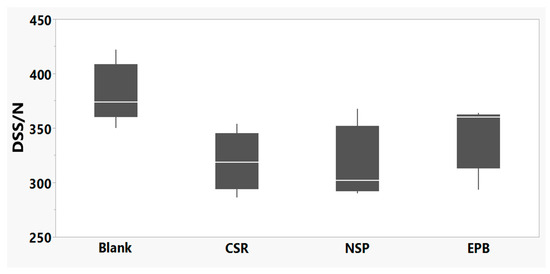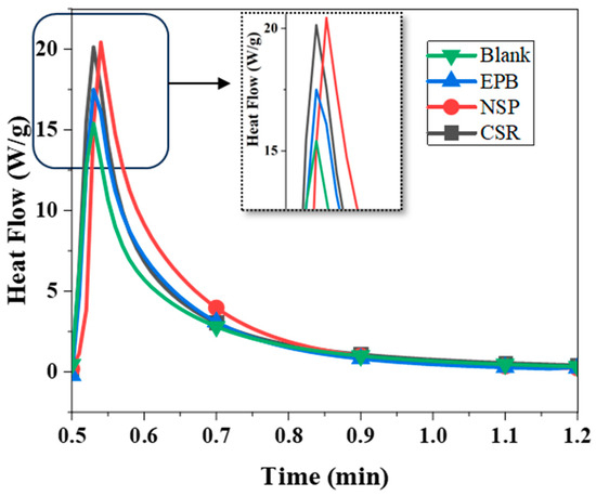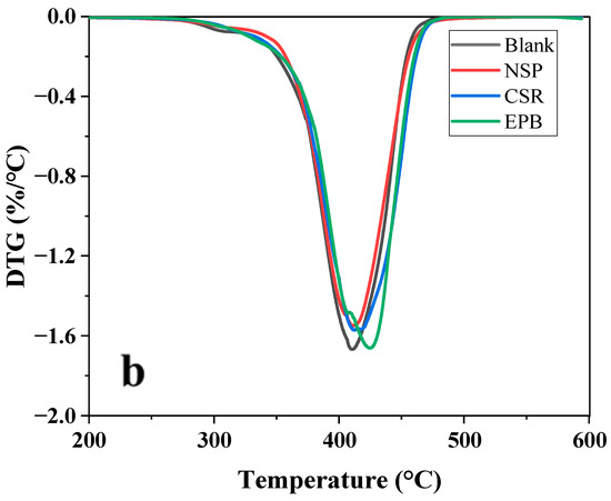 The blank sample had a moderate residual weight of 3.3%, indicating that most of the materials decomposed after 500 °C. The NSP formulation had the highest residual weight due to nano-silica being an inorganic material, reflecting the thermal stability imparted by the nano-silica particles. The CSR and EPB formulations showed the lowest residual weight, balancing the rubber phase’s contribution to thermal stability.
