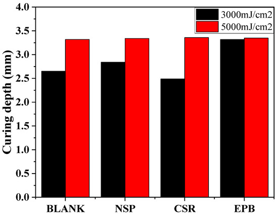 From the chart, under low curing energy (3000 mJ/cm2), EPB samples showed the deepest curing depth, consistent with its rapid curing reaction, even much deeper than the blank samples. NSP slightly reduced the curing depth, likely due to the increased scattering of UV light by nanoparticles. CSR further reduced the curing depth, with the rubber phase absorbing more UV light and limiting penetration, even though it was shallower than the blank samples. CSR had the most significant impact from the shell and core rubber, resulting in the shallowest curing depth due to its opacification and UV light absorption. After increasing the curing energy to 5000 mJ/cm2, the curing depth showed different results compared to low curing energy. When the samples were cured with 5000 mJ/cm2 UV energy, all the samples had similar curing depths.