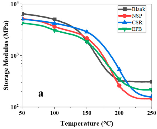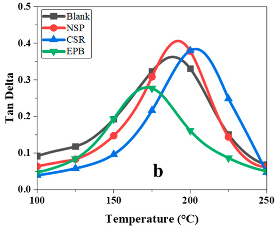 DMA was used to evaluate the thermomechanical properties of the cured formulations. Figure 3a,b present the storage modulus and loss factor (tan δ) curves, respectively. The blank sample exhibited the highest storage modulus, indicating the highest rigidity. The addition of NSP improved the storage modulus compared to CSR and EPB due to the reinforcing effect of the nanoparticles. CSR showed a moderate decrease in storage modulus, with the rubber phase providing some flexibility. EPB resulted in the lowest storage modulus, reflecting its significant toughening effect at the expense of rigidity.